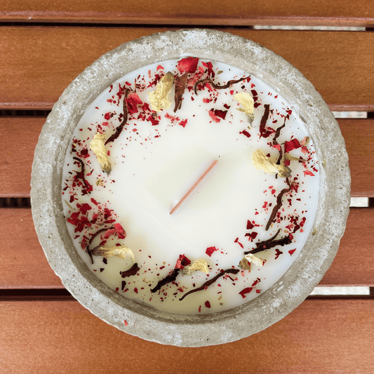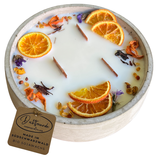 Limitierte Einzelstücke: Outdoor Citronella-Betonkerze „Mugge Schreck“ – Handgemachter Insektenschutz aus dem Südschwarzwald mit Blütenverzierung