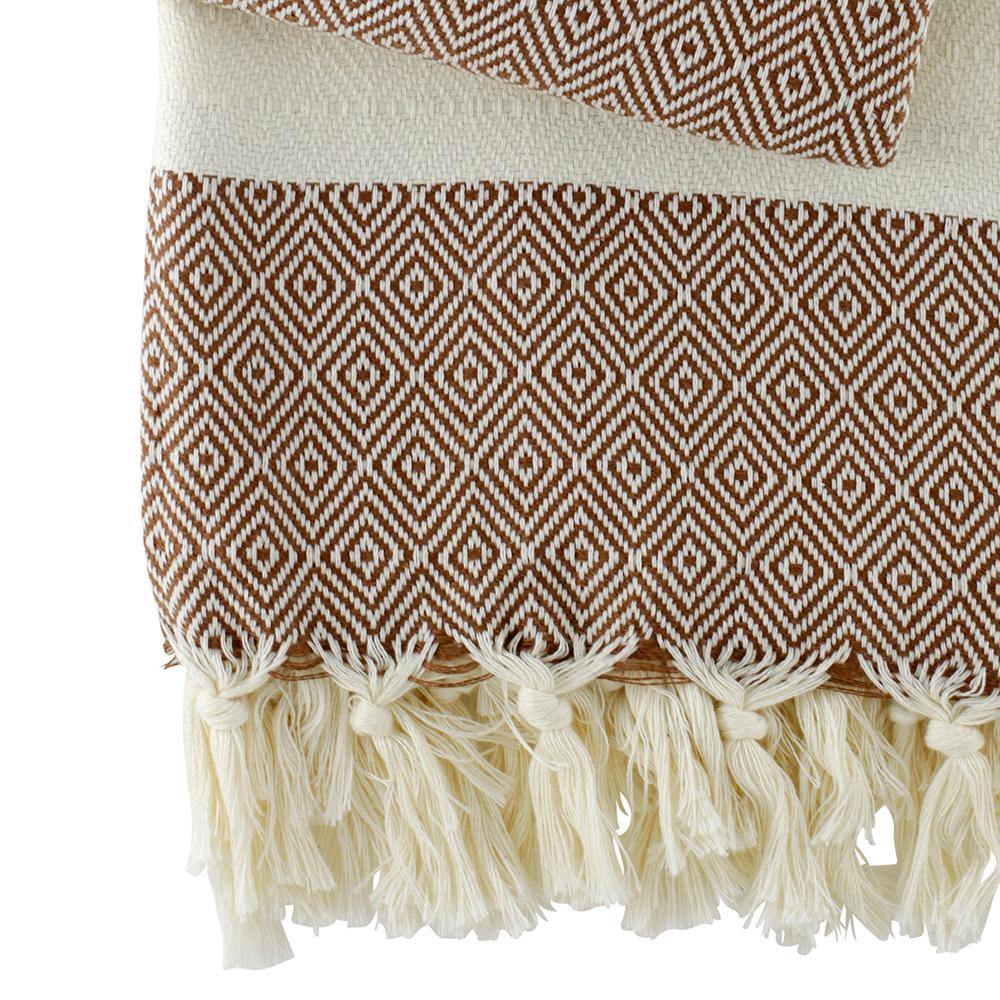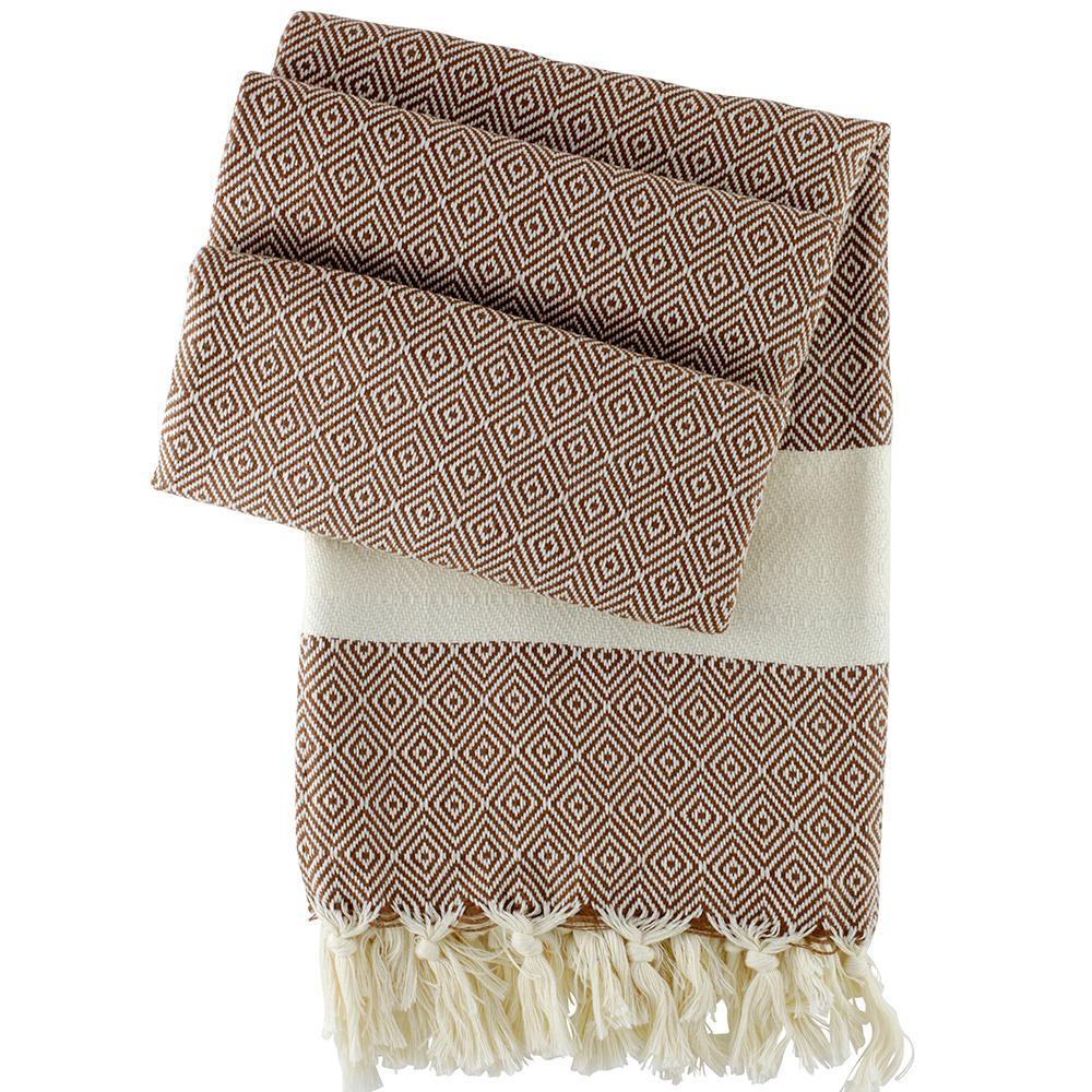 ca. 100 x 170 cm, 100% Baumwolle, naturweiß/braun, ca. 400 Gramm, Flächengewicht 220 g/m². Waschen bis 40 Grad, Wäschetrockner möglich.