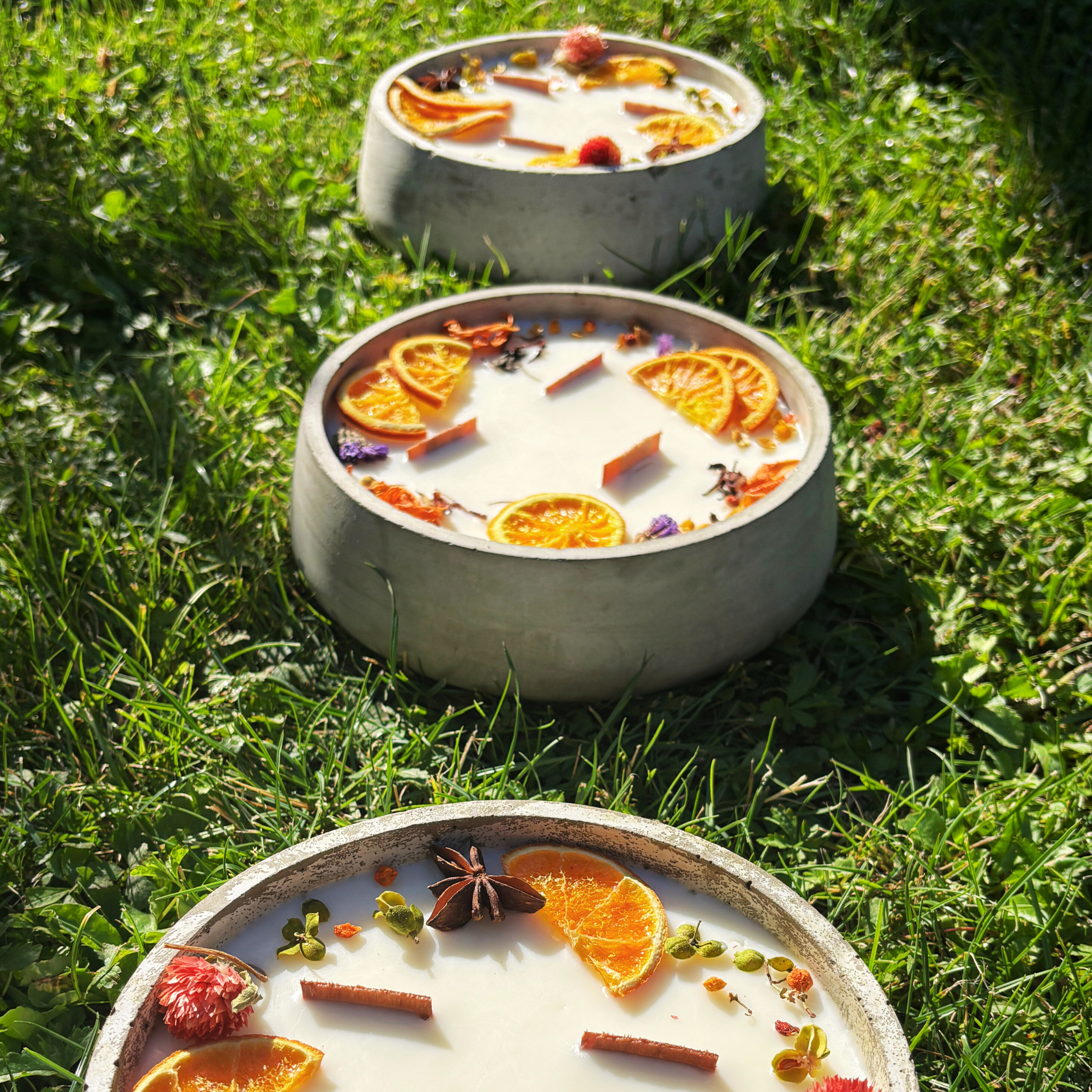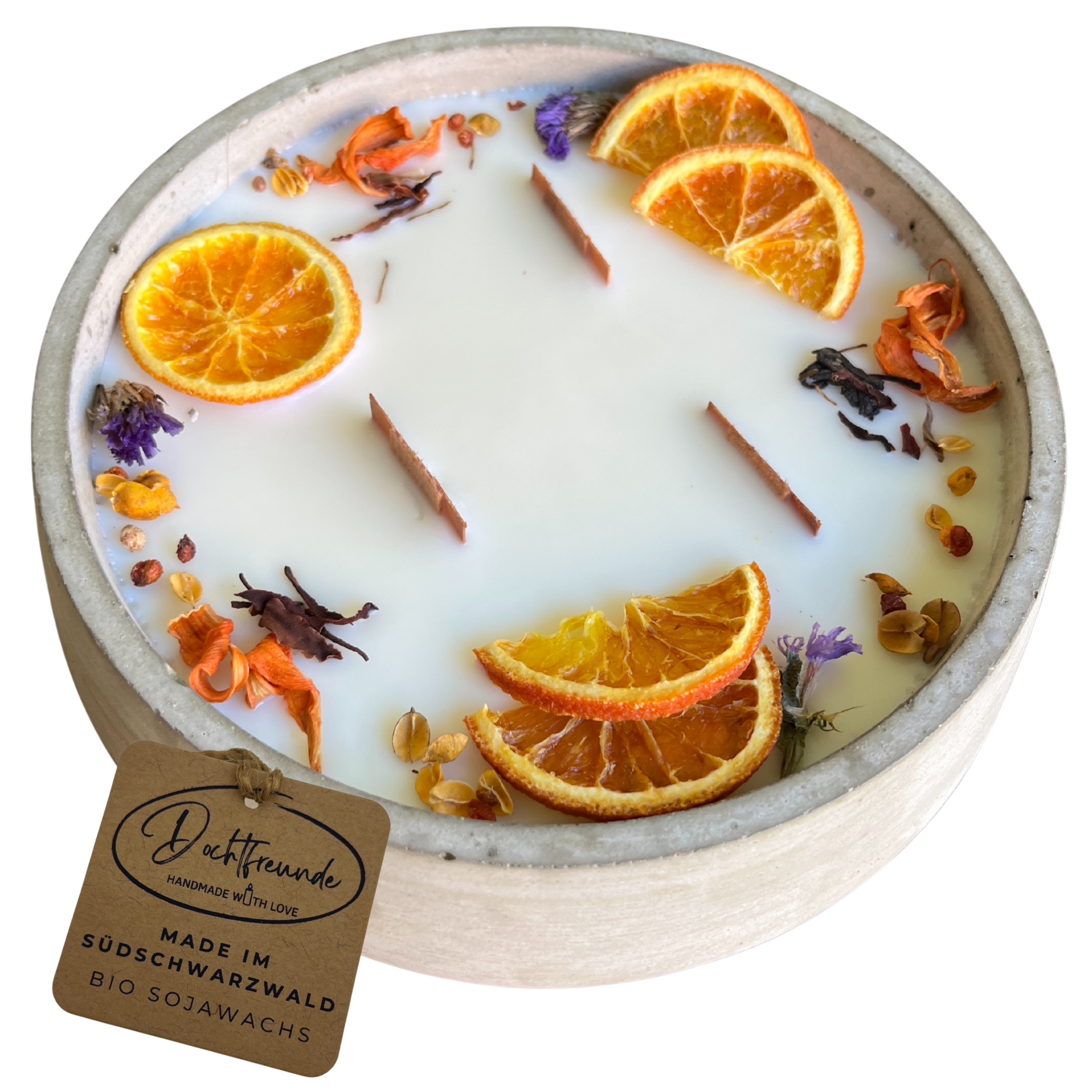 - Material: Veganes Sojawachs, versiegelter Beton, Holzdocht, getrocknete Blüten.