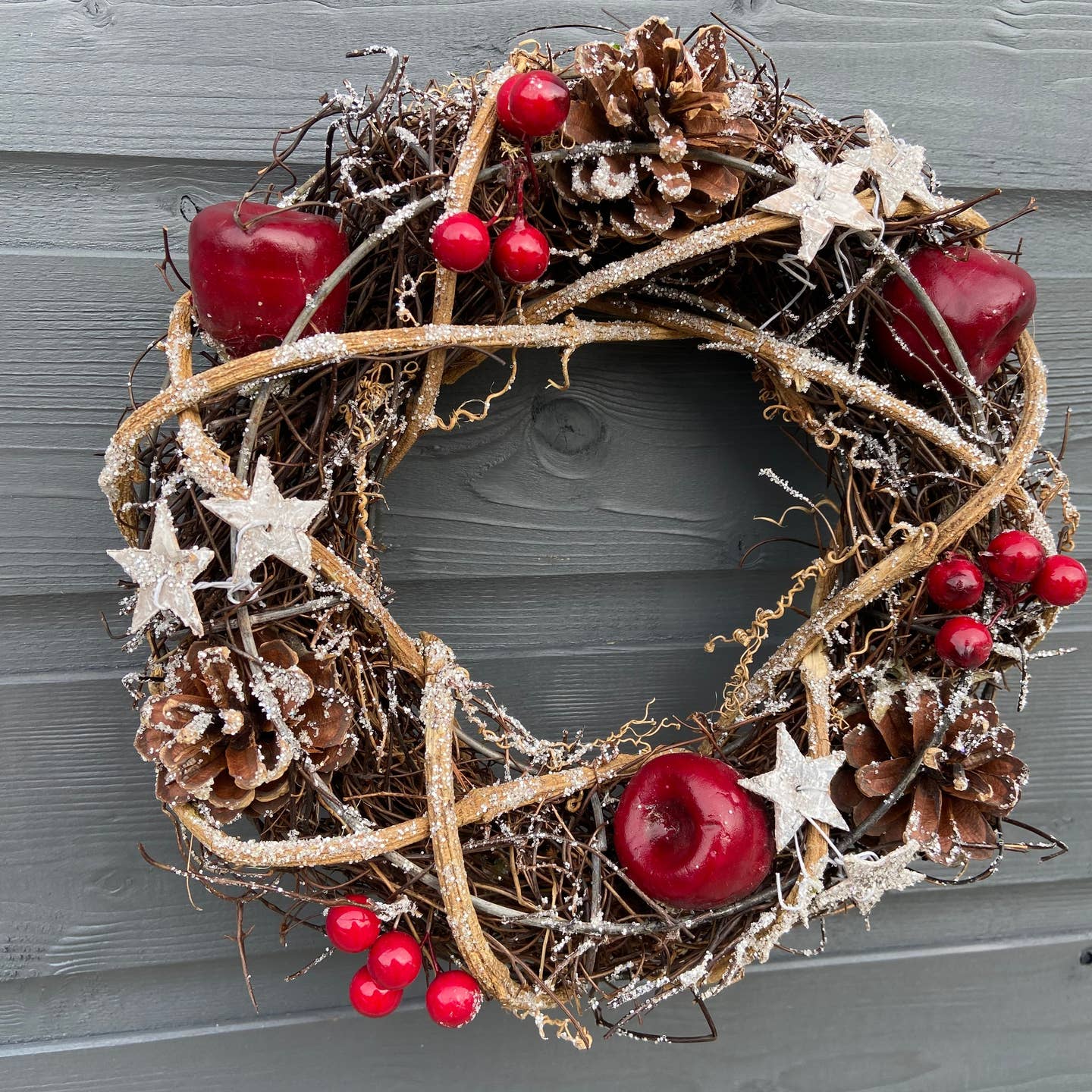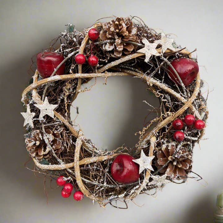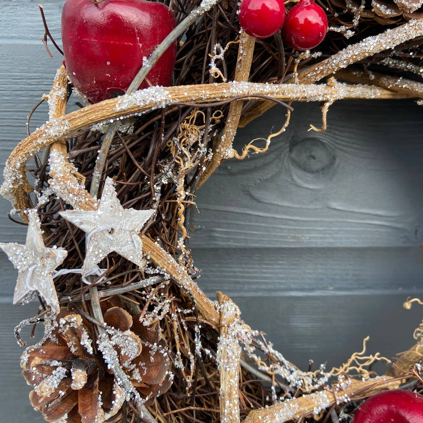 Handgefertigter Weihnachtskranz mit Beeren, Holz und Sternen