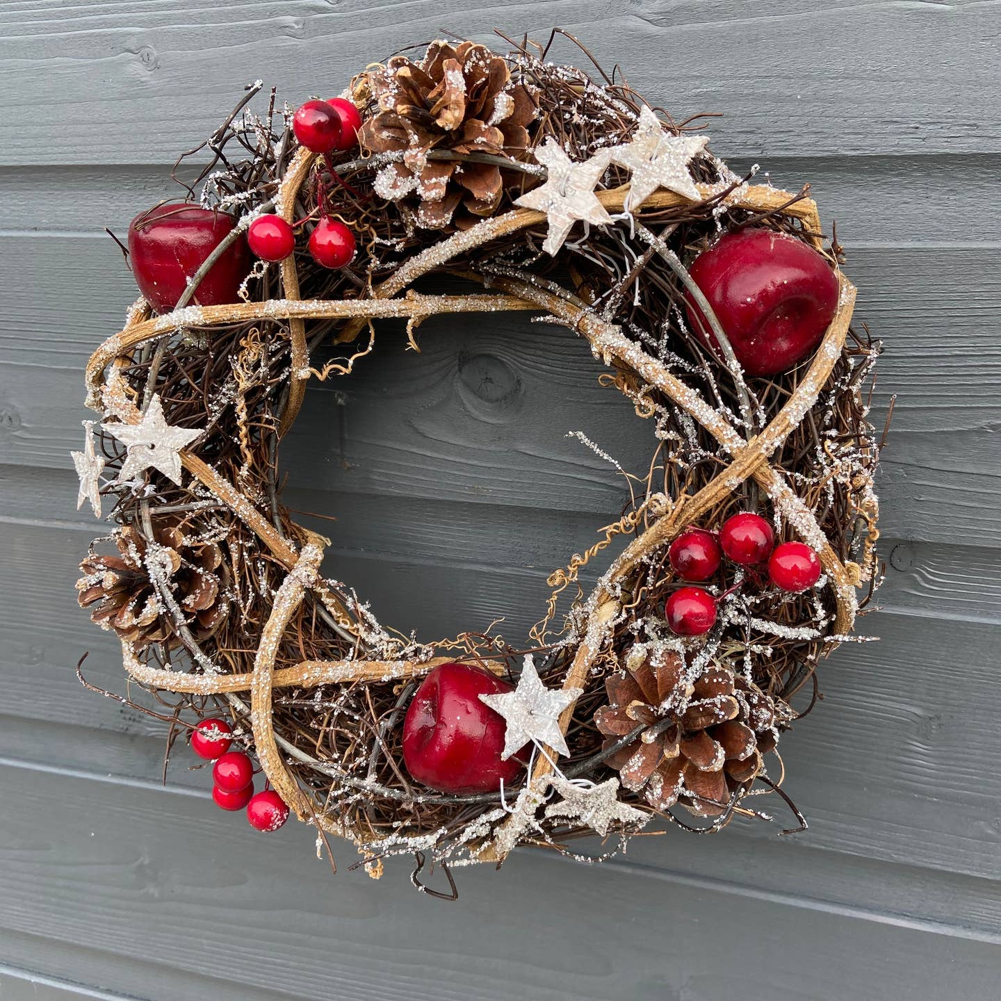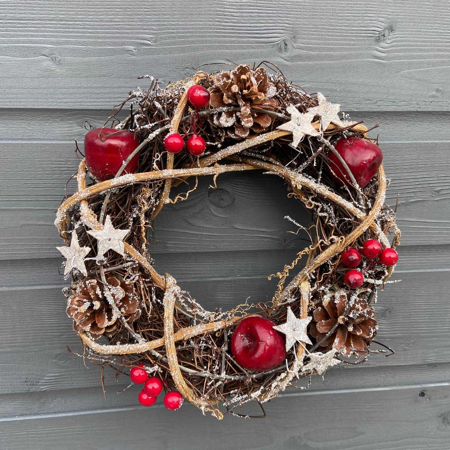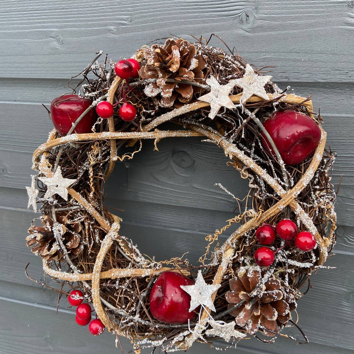 Handgefertigter Weihnachtskranz mit Beeren, Holz und Sternen