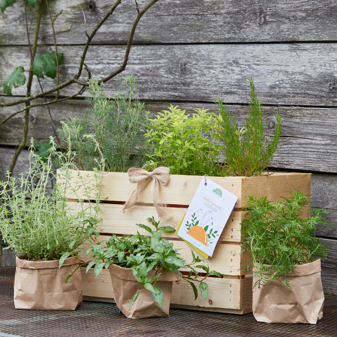 Die Pflanzen werden in der Holzkiste mit entsprechenden 'Setcards' geliefert. Mehr Informationen zu diesem Set und den enthaltenen Pflanzen findest du weiter unten auf dieser Seite. Sollte eine Pflanze kurzfristig nicht verfügbar sein, wird sie durch eine ähnliche Pflanze ersetzt.